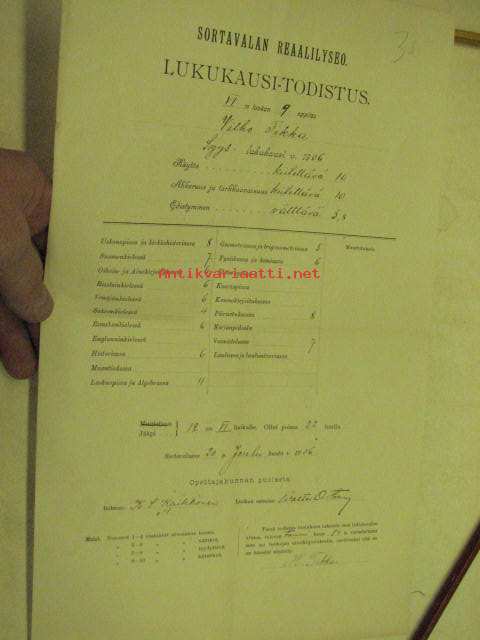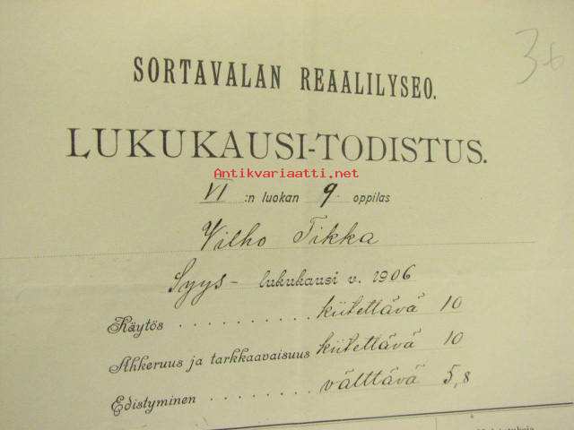 Sortavalan Reaalilyseo, lukukausi-todistus Vilho Tikka 1906