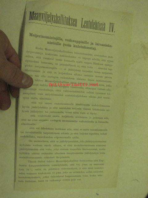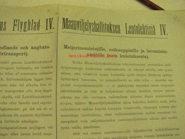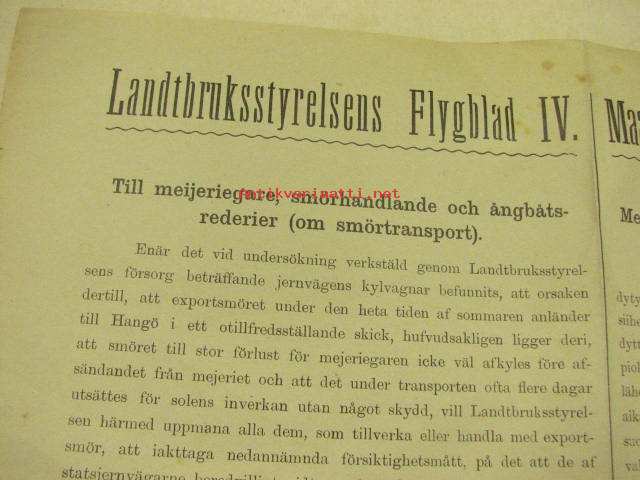 Meijeri -aihe: Maanviljelyshallituksen lentolehtisiä nr IV - Meijerinomistajille, voikauppiaille, ja laivanisännistöille (voin kuletuksesta) - Till meijeriägare, smörhandlande, och ångbåtsrederier (om smörtransport)