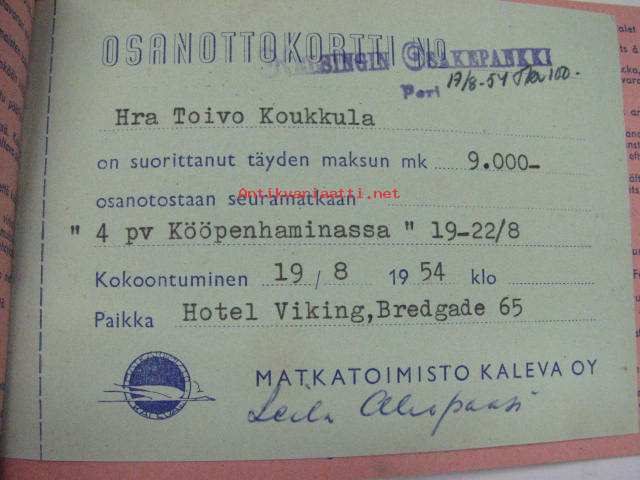Matkatoimisto Kaleva Oy, osanottokortti / kuitti maksusta seuramatkaan "4 pv Kööpenhaminassa" 1954, hra Toivo Koukkula