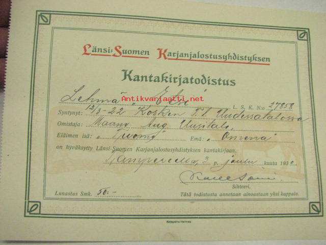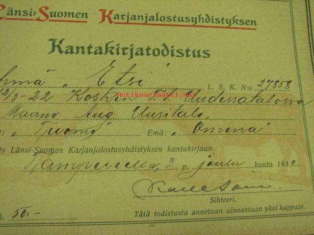 Länsi-Suomen Karjanjalostusyhdistyksen Kantakirjatodistus Lehmä "Etsi", Koski Tl Uusitalo, 3.12.1930