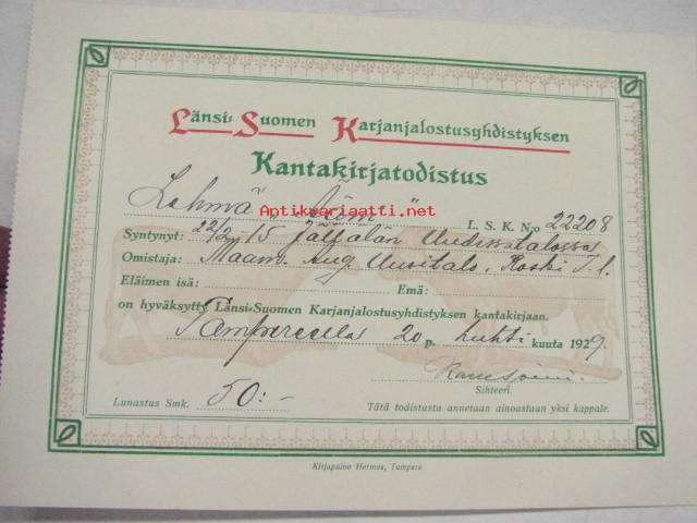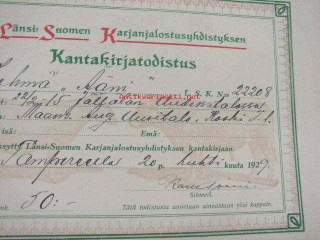 Länsi-Suomen Karjanjalostusyhdistyksen Kantakirjatodistus Lehmä "Ääni", Koski Tl Uusitalo, 20.4.1929
