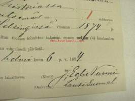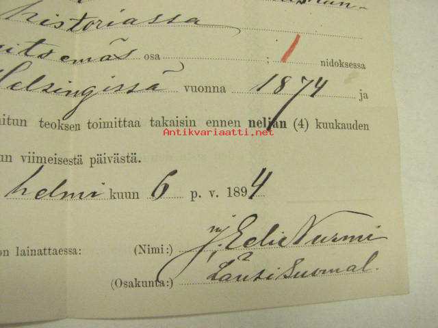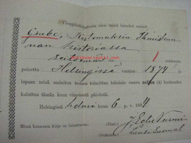 Ylioppilaskirjaston lainauskuitti 6.2.1894, "Kertomuksia ihmiskunnan historiassa", J. Eeli Nurmi, Länsi-Suomalainen osakunta