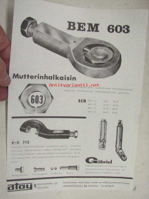 | Saatavilla | 1 kpl | | Julkaisuvuosi | 196? | | Sivuja | 1 | | Kunto | K3 | | Sidonta/painoasu | Pienpainate | | Kielet | Suomi |