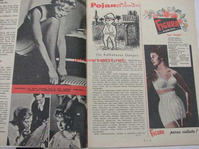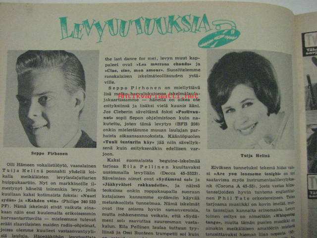 | Saatavilla | 1 kpl | | Julkaisuvuosi | 1961 | | Sivuja | 40 | | Kunto | K2 | | Ei keskiaukeamakuvaa. Pieni kuponki leikattu irti. Pikkukuvissa: Seppo Pirhonen, Tuija Helinä. | | Sidonta/painoasu | Lehti | | Kielet | Suomi |