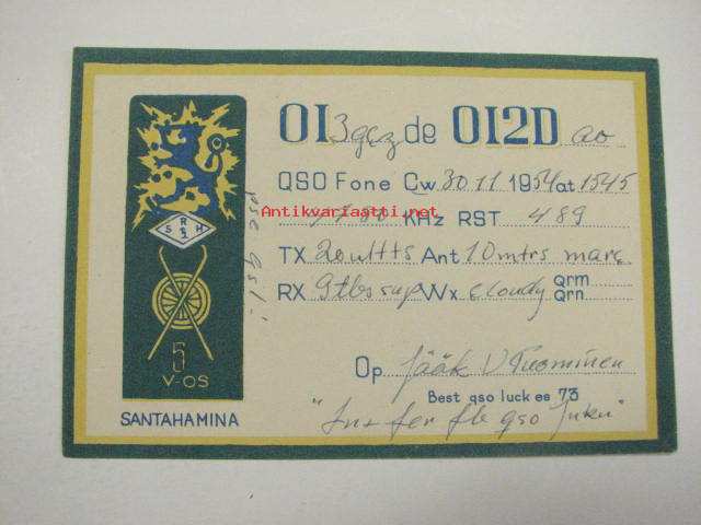 OI3DCZ / OI2DGO 5 V-OS Santahamina 30.11.1954, operator V. Tuominen -puolustusvoimain radiosähköttäjän yhteyskortti