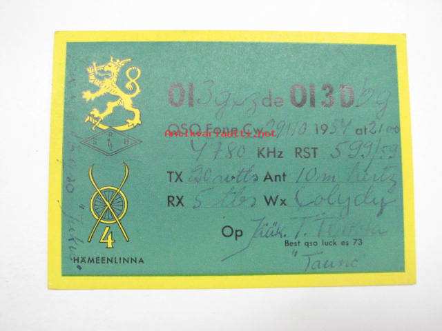 OI3DCZ / OI3DBG Jääkäripataljoona 4 Hämeenlinna 29.10.1954, operator Tauno Peltola -puolustusvoimain radiosähköttäjän yhteyskortti
