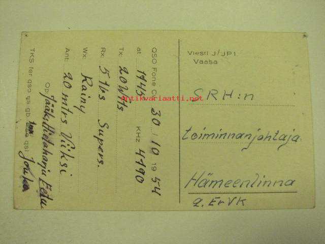 OI3DCZ / OI6AIH QTH Vaasa 30.10.1954, operator Eetu Hietaharju -puolustusvoimain radiosähköttäjän yhteyskortti