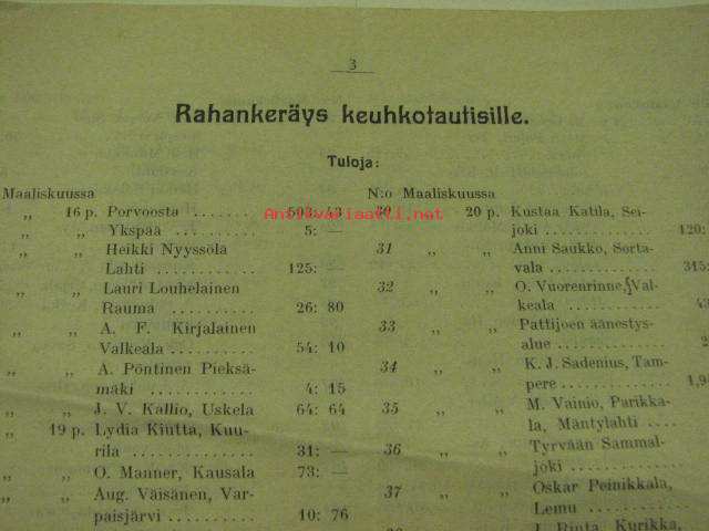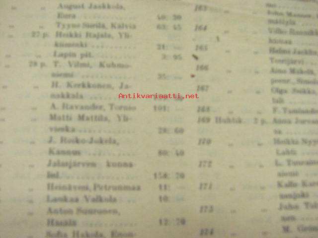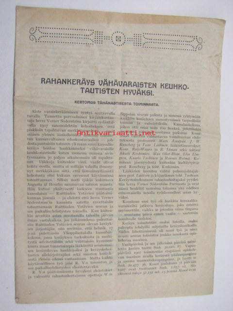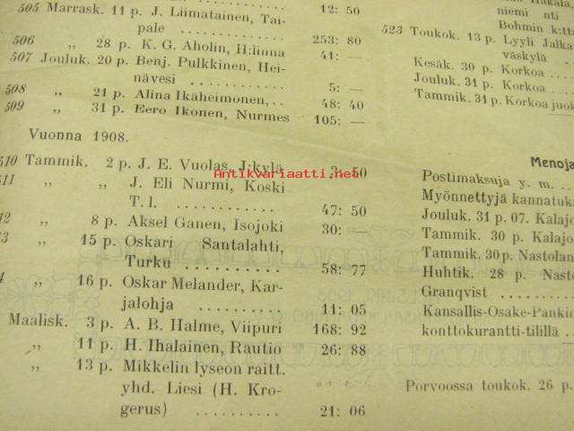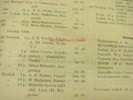 | Saatavilla | 1 kpl | | Julkaisuvuosi | 1908 | | Sivuja | 12 | | Kunto | K2 | | Sidonta/painoasu | Pienpainate | | Kielet | Suomi |