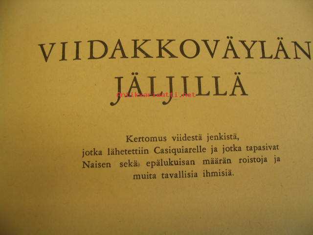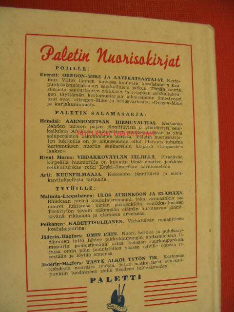 | Saatavilla | 1 kpl | | Julkaisuvuosi | 1948 | | Sivuja | 144 | | Kunto | K3 | | hyvä siisti, ei ed. omistajan nimeä. | | Sidonta/painoasu | Sidottu (kovak.) | | Kielet | Suomi |
