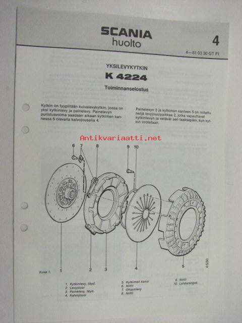 Scania huolto 4 Yksilevykytkin K 4224 toiminnanselostus - huolto - purku - korjaus -korjaamokirjasarjan osa