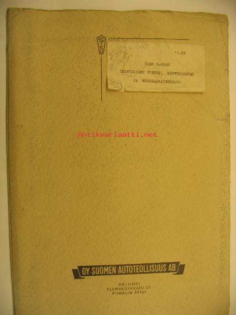| Saatavilla | 1 kpl | | Julkaisuvuosi | 1959 | | Kunto | K3 | | Sidonta/painoasu | Kansio | | Kielet | Suomi |