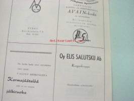 | Saatavilla | 1 kpl | | Julkaisuvuosi | 1950 | | Sivuja | 8 | | Kunto | K3 | | Sidonta/painoasu | Nidottu (pehmeäk.) | | Kielet | Suomi |