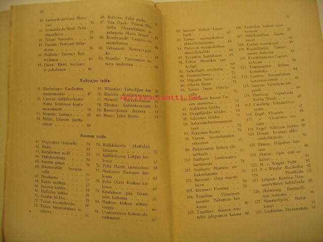 Ikäänsä nähden vielä hyvä, ehjä muuten kuin pehmeiden kansien osalta. Kuvissa sekä koti- että ulkomaisia kohteita veistoksista kartanoihin ja kirkkoihin.