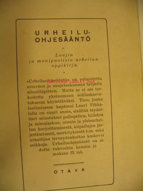 | Saatavilla | 1 kpl | | Julkaisuvuosi | 1927 | | Sivuja | 146 | | Painos | 2 uudistettu | | Kunto | K2 | | liimaus on kestänyt, kellastunut | | Sidonta/painoasu | Nidottu (pehmeäk.) | | Kielet | Suomi |