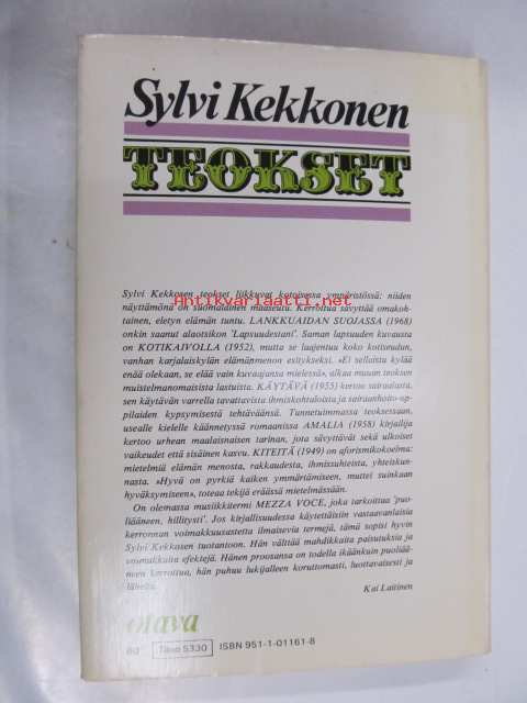 | Saatavilla | 1 kpl | | Julkaisuvuosi | 1974 | | Sivuja | 320 | | Painos | 3. | | Kunto | K3 | | Sidonta/painoasu | Sidottu (kansipaperit) | | ISBN | 951-1-01161-8 | | Kielet | Suomi |