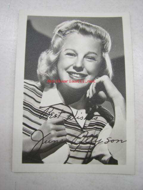 June Allyson -filmitähden ihailijakortti, lähetetty Turkuun, painettu nimikirjoitus