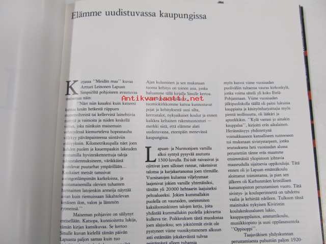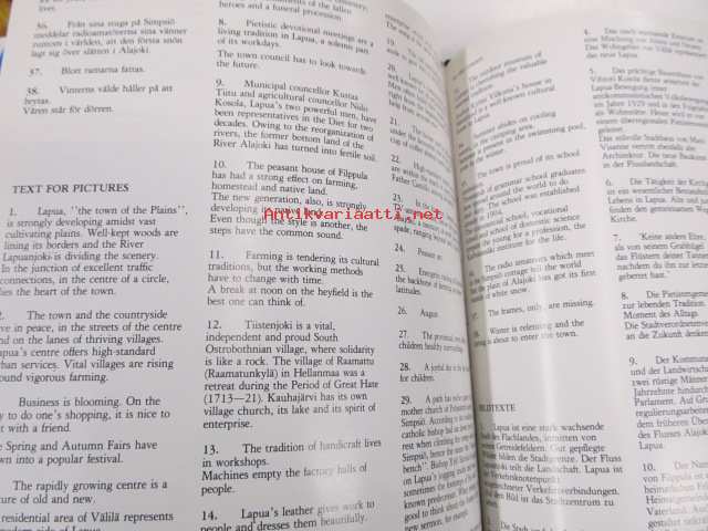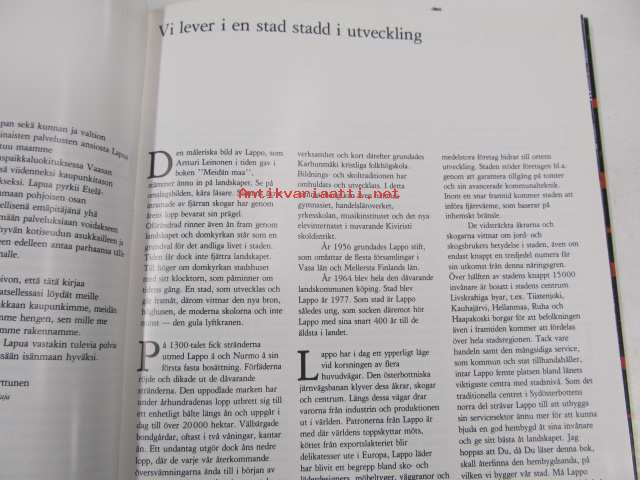 | Saatavilla | 1 kpl | | Julkaisuvuosi | 1980 | | Painos | 1. | | Kunto | K3 | | Sidonta/painoasu | Sidottu (kovak.) | | ISBN | 951-9013-84-9 | | Kielet | Suomi, Ruotsi, Englanti, Saksa |