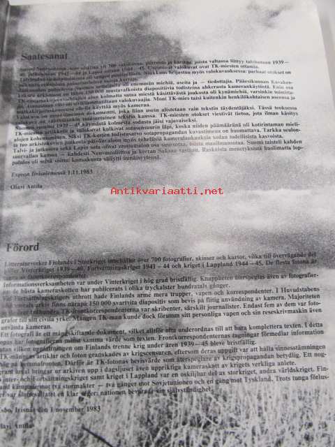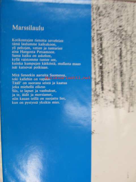 | Saatavilla | 1 kpl | | Julkaisuvuosi | 1987 | | Sivuja | 295 | | Kunto | K2 | | Sidonta/painoasu | Sidottu (kovak.) | | ISBN | 951-99836-4-3 | | Kielet | Suomi, Ruotsi |