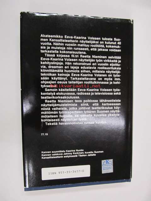 | Saatavilla | 1 kpl | | Julkaisuvuosi | 1985 | | Sivuja | 223 | | Painos | 1. | | Kunto | K3 | | Sidonta/painoasu | Sidottu (kansipaperit) | | ISBN | 951-35-3417-0 | | Kielet | Suomi |