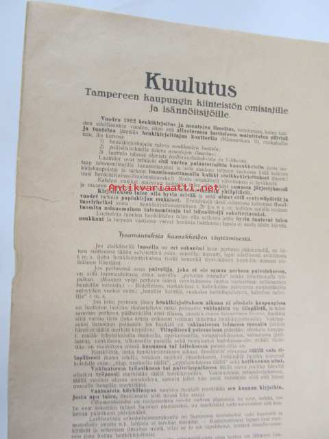 Kuulutus Tampereen kaupungin kiinteistön omistajille ja isännöitsijöille vuoden 1922 henkikirjoitus ja asuntojen ilmoitus