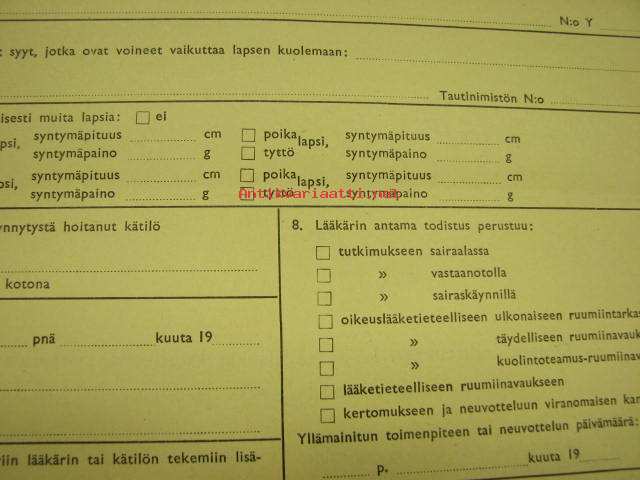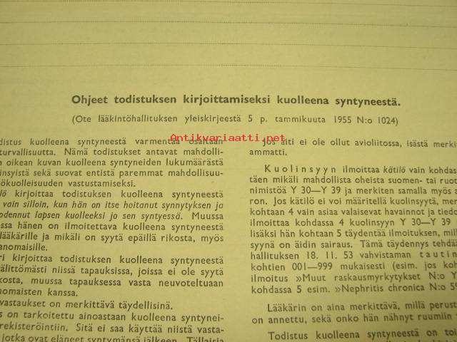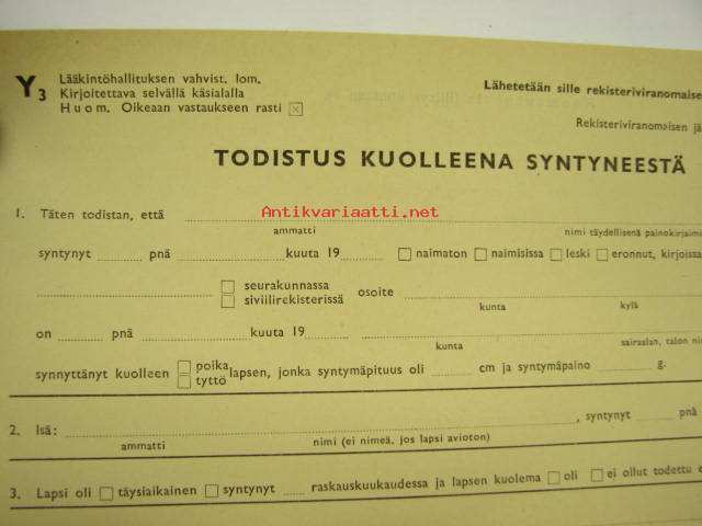 Todistus kuolleena syntyneestä -Lääkintöhallitus Y3-lomake 1955