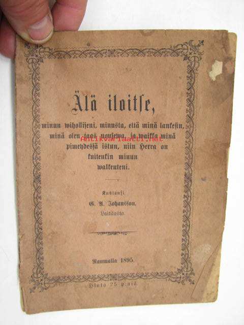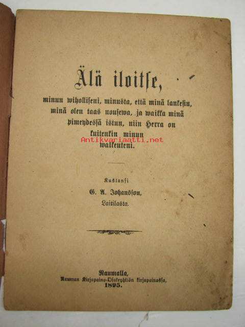 Älä iloitse, minun viholliseni, minusta, että minä lankesin, minä olen taas nouseva, ja waikka minöä pimeydessä istun, niin Herra on kuitenkin walkeuteni; kustansi B. Johansson Laitilasta -uskonnollinen pamfletti