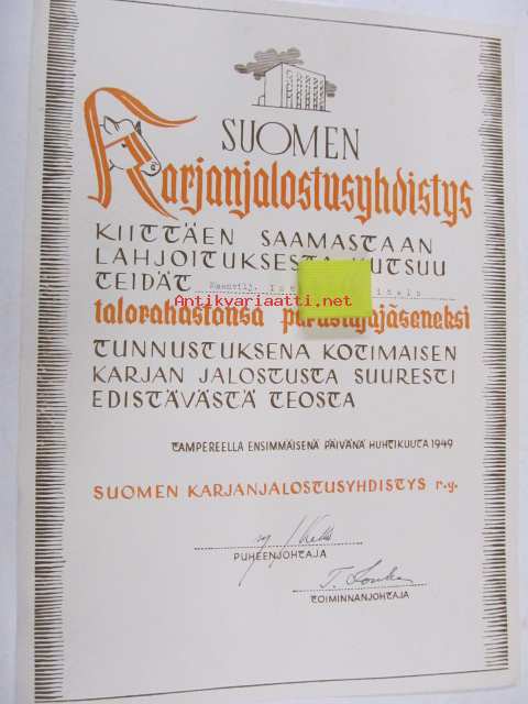 Suomen Karjanjalostusyhdistys kiittäen saamastaan lahjoituksesta kutsuu teidät Inkeri Uusitalo talorahastonsa perustajajäseneksi 1.4.1949