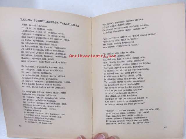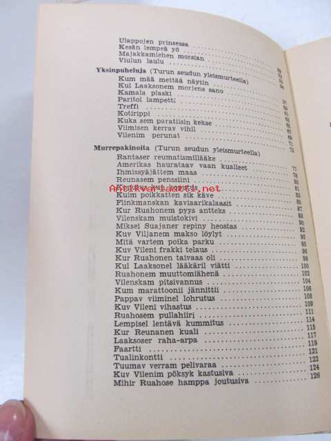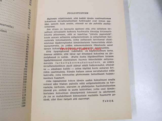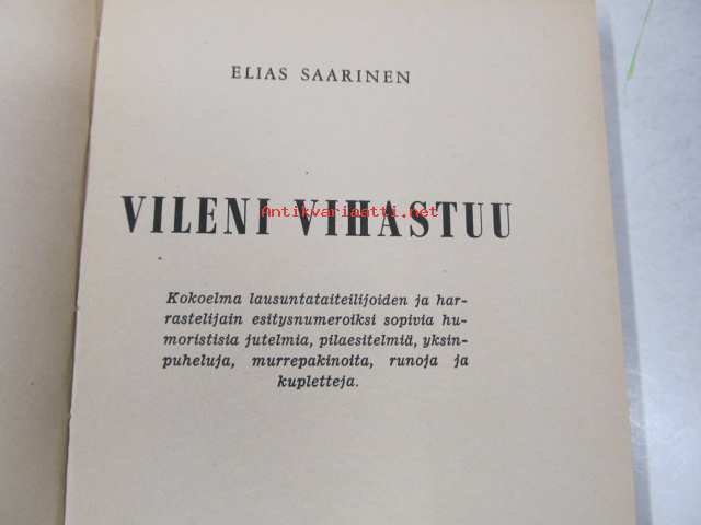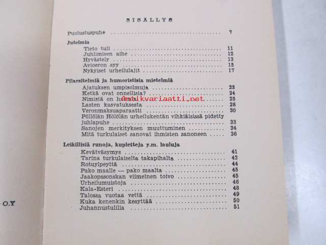 Kokoelma lausuntataiteilijoiden ja harrastelijain esitysnumeroiksi sopivia humoristisia jutelmia, pilaesitelmiä, yksinpuheluja, murrepakinoita, runoja ja kupletteja