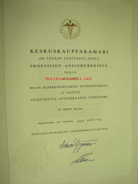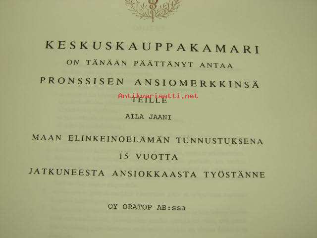 Keskuskauppakamari pronssinen ansiomerkki Aila Jaani -myöntökirja