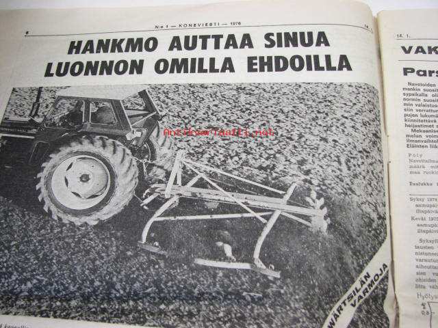 Koneviesti 1976 nr 1 -mm. Artikkelit, mainokset, kuvat; Raket 521 E, Hankmo, Vakola parsinavettatutkimus, Uudet Fiat-traktorit, Viljankuivurit 1976, Wartburg 353 W,