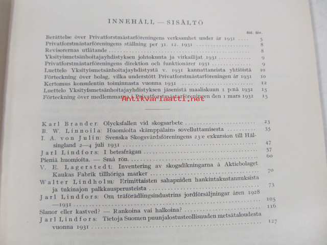 | Saatavilla | 1 kpl | | Julkaisuvuosi | 1932 | | Sivuja | 159 | | Painos | 1. | | Kunto | K3 | | Sidonta/painoasu | Sidottu (kovak.) | | Kielet | Suomi, Ruotsi |
