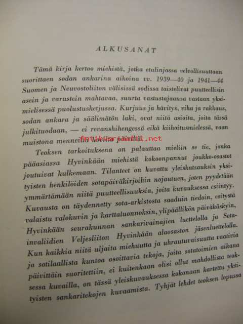 Hietala William, Mercatorin kirjapaino, 1954Kirja kertoo miehistä etulinjassa vv 1939 ja 1941-44. Joitakin m/v valokuvia.
