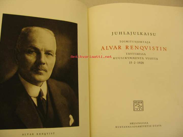 Numeroitu 1270/1500, teosta ei ole valmistettu myyntiin vaan se on Otavan johtokunnan julkaisu toimitusjohtaja Alvar Renqvistille hänen täyttäessään 60 vuotta. Kymmenien eri kirjoittajien eri aiheisia artikkeleita.