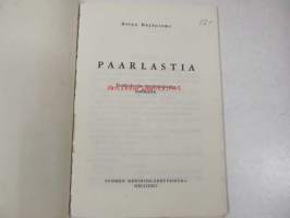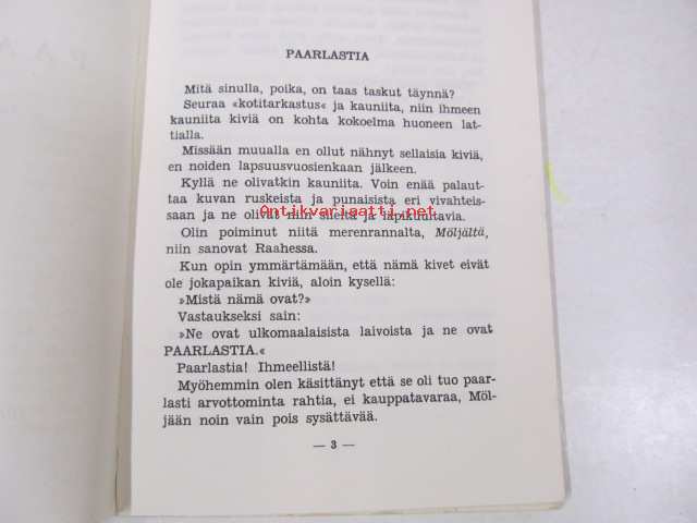 | Saatavilla | 1 kpl | | Julkaisuvuosi | 1954 | | Sivuja | 31 | | Painos | 1. | | Kunto | K3 | | Sidonta/painoasu | Nidottu (pehmeäk.) | | Kielet | Suomi |