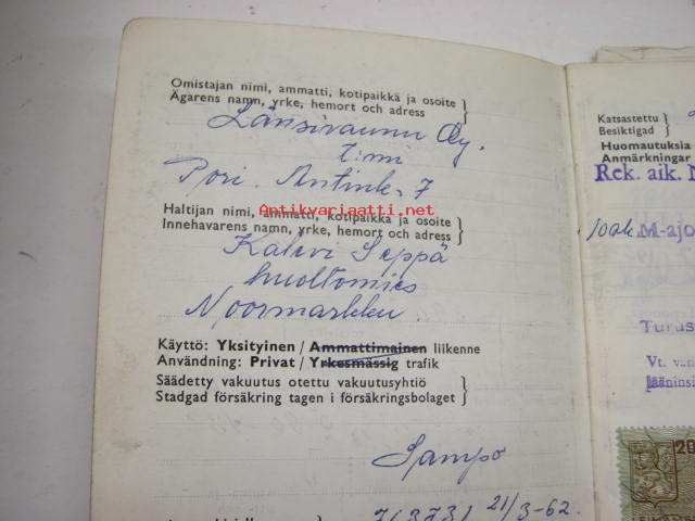 | Saatavilla | 1 kpl | | Julkaisuvuosi | 1962 | | Kunto | K2 | | Kulunut | | Sidonta/painoasu | Nidottu (pehmeäk.) | | Kielet | Suomi, Ruotsi |