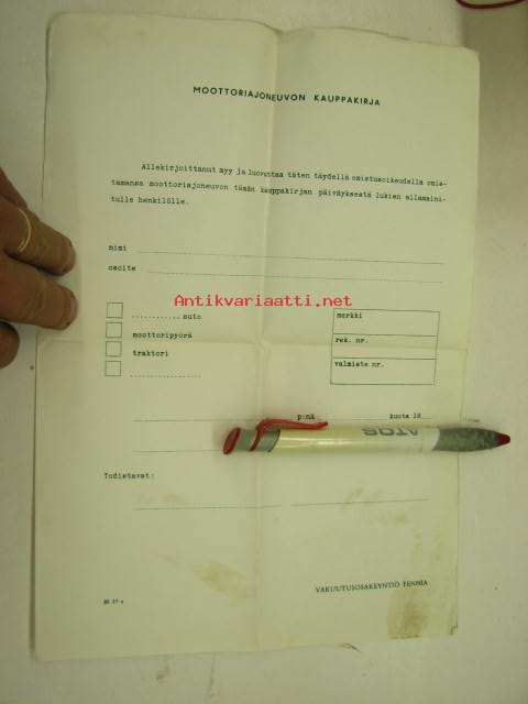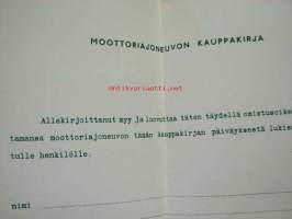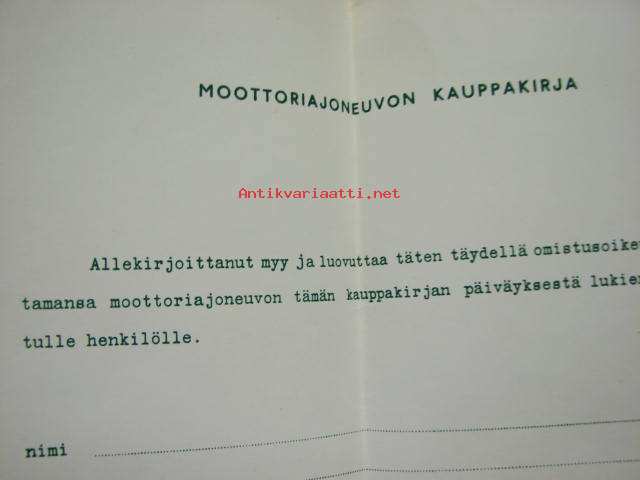 Ajoneuvon kauppakirjalomake 1950/60-luvuilta, käyttämätön, ei kohteen tietoja kirjoitettu, myyjän allekirjoitus valmiina