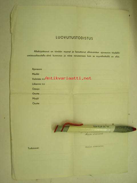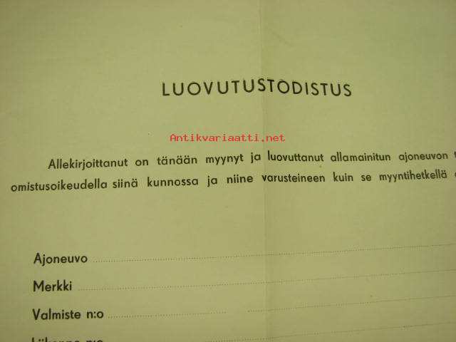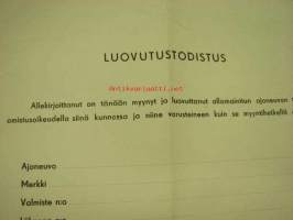 Ajoneuvon luovutustodistuslomake 1950/60-luvuilta, käyttämätön, ei kohteen tietoja kirjoitettu, myyjän allekirjoitus valmiina