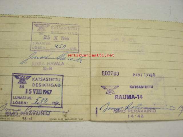 | Saatavilla | 1 kpl | | Julkaisuvuosi | 1966 | | Kunto | K2 | | Kulunut | | Sidonta/painoasu | Nidottu (pehmeäk.) | | Kielet | Suomi, Ruotsi |