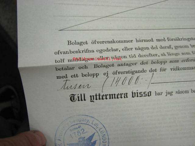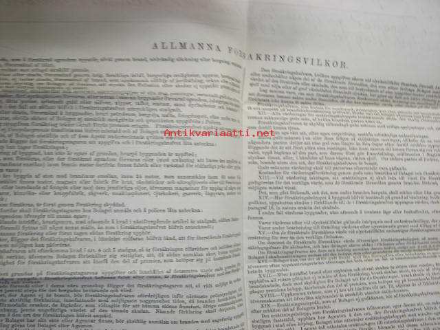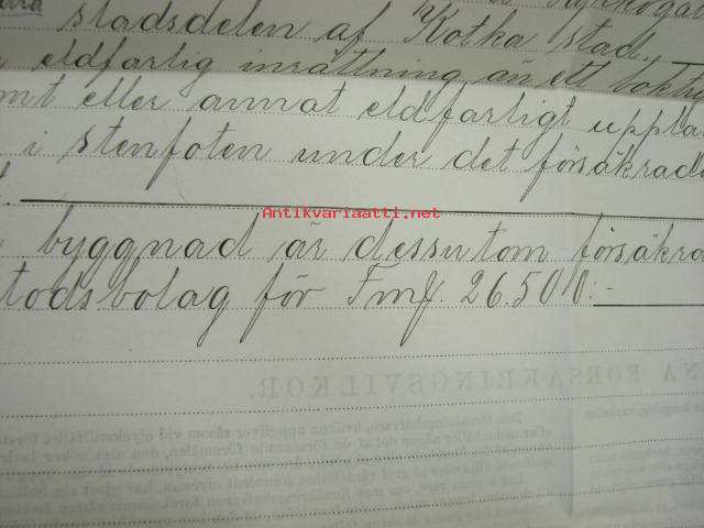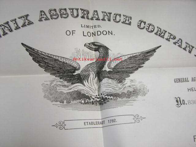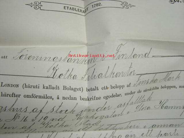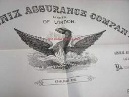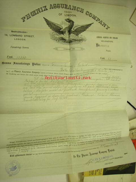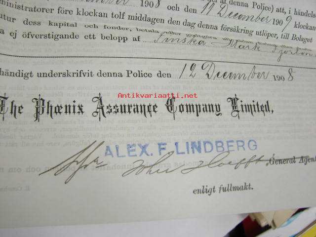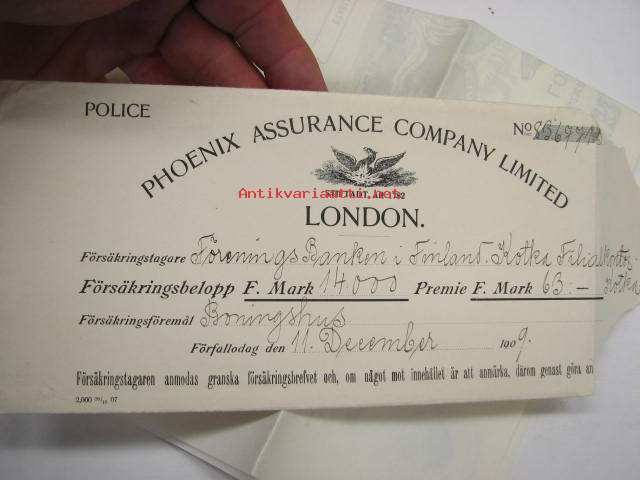 Phoenix assurance company Ltd / Föreningsbanken i Finland - Kotka Filialkontor 12.8.1908 -vakuutusasiakirja