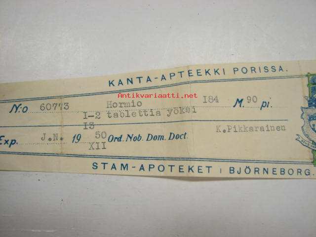 Kauppatorin Apteekki Porissa Gösta Widbom, 15.10.1951 nr 53744 -apteekkisignatuuri