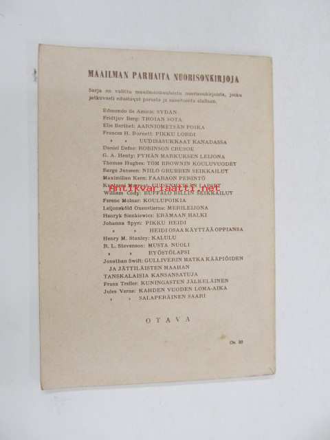 | Saatavilla | 1 kpl | | Julkaisuvuosi | 1958 | | Sivuja | 80 | | Painos | 8. | | Kunto | K3 | | Sidonta/painoasu | Nidottu (pehmeäk.) | | Kielet | Suomi |