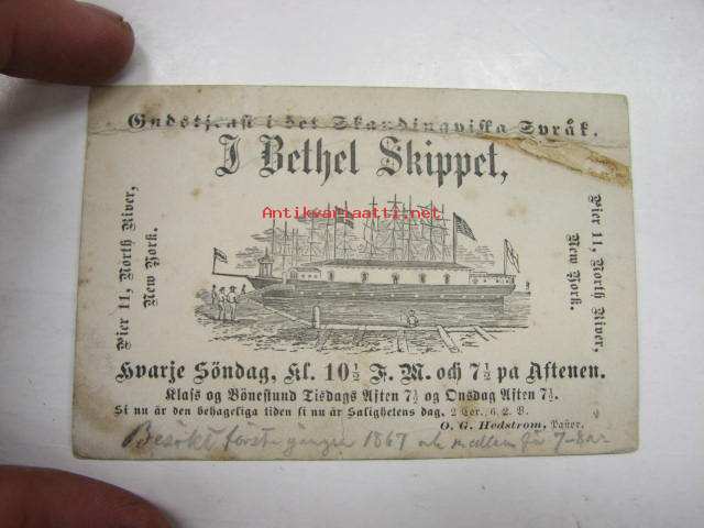 7 x 11 cm. Alareunassa lyijykynällä kirjoitettu teksti "Besökt första gången 1867 och medlem för 7-8 år." -vieraillut ensimmäisen kerran 1867 ja ollut jäsenenä 7-8 vuotta. Suomalainen purjelaivakauden aikainen ultraharvinainen painate.