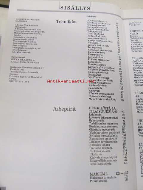 | Saatavilla | 1 kpl | | Julkaisuvuosi | 1987 | | Sivuja | 288 | | Painos | 1 | | Kunto | K3 | | Sidonta/painoasu | Sidottu (kansipaperit) | | ISBN | 951-873-128-4 | | Kielet | Suomi |