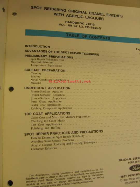 Ford Motor Co., 1969Fordin huollon ja korjausten ammattilaisten käyttöön tarkoitettu opaskirja.