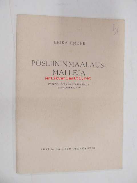 | Saatavilla | 1 kpl | | Julkaisuvuosi | 1957 | | Sivuja | 39 | | Painos | 1. | | Kunto | K3 | | Sidonta/painoasu | Vihko | | Kielet | Suomi |