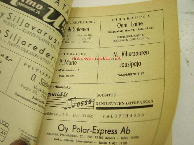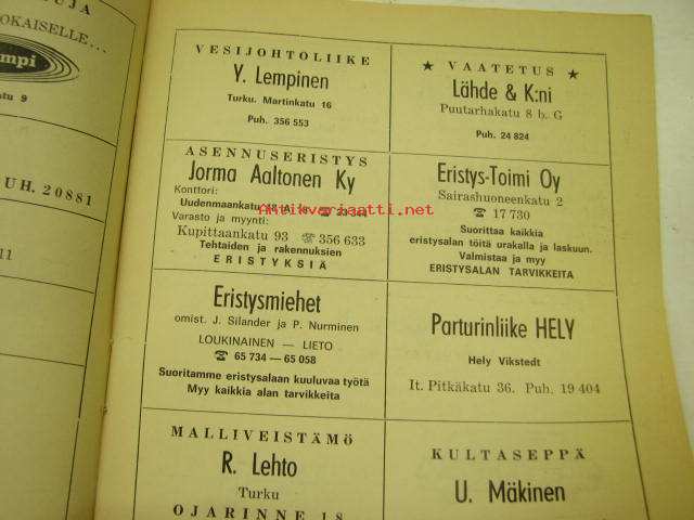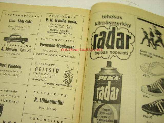 | Saatavilla | 1 kpl | | Julkaisuvuosi | 1968 | | Sivuja | 20 | | Kunto | K2 | | Sidonta/painoasu | Pienpainate | | Kielet | Suomi |
