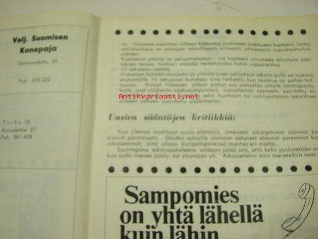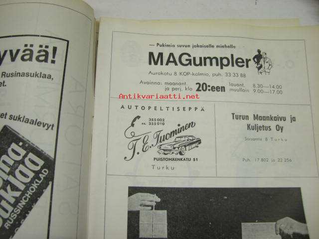 | Saatavilla | 1 kpl | | Julkaisuvuosi | 1970 | | Sivuja | 30 | | Kunto | K2 | | Sidonta/painoasu | Pienpainate | | Kielet | Suomi |