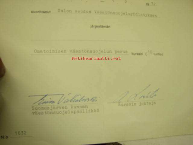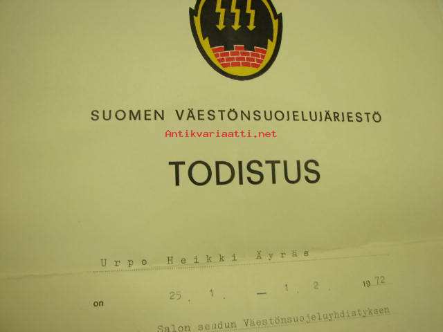 Suomen väestönsuojelujärjestö, omatoimisen väestönsuojelun peruskurssi - todistus Urpo Äyräs, 1972