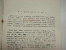 | Saatavilla | 1 kpl | | Julkaisuvuosi | 1950 | | Sivuja | 32 | | Painos | 1. | | Kunto | K2 | | Niitit ruosteessa | | Sidonta/painoasu | Vihko | | Kielet | Suomi |
