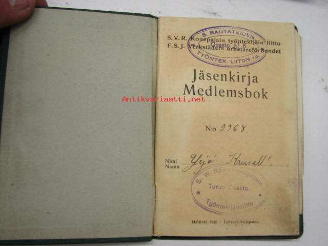 S.V. R. Konepajain työntekijäin liitto jäsenkirja Yrjö Krusell 1925